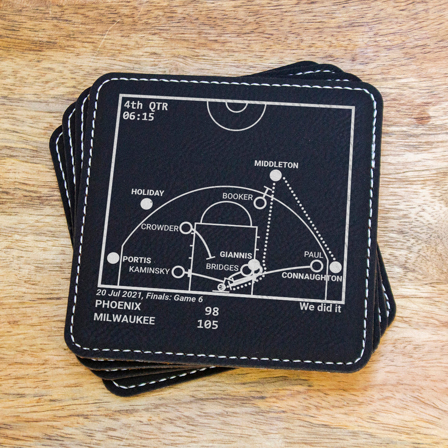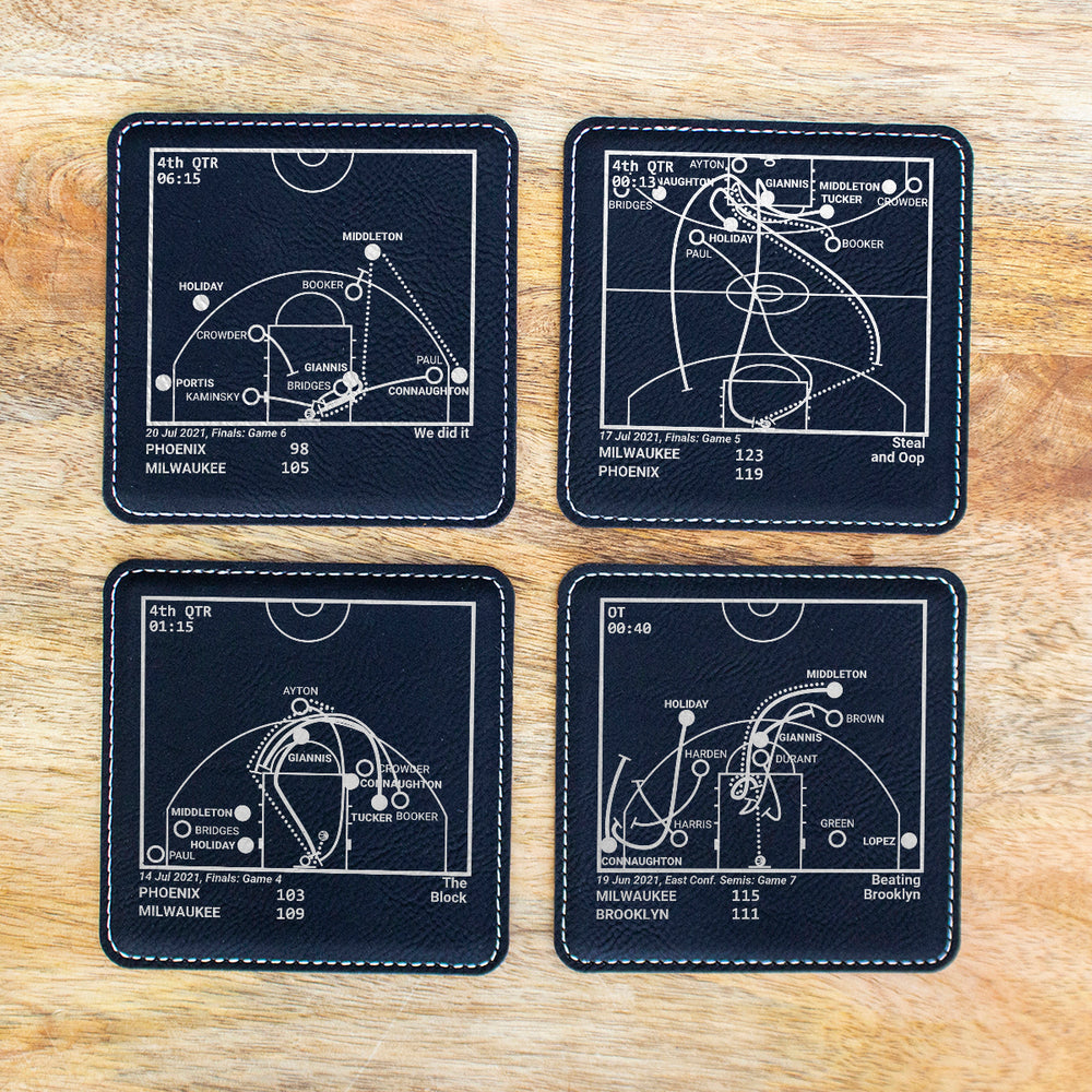 - Set of four coasters laser-etched with the Milwaukee Bucks greatest moments.