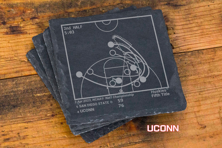 - Set of four coasters laser-etched with the UCONN Huskies greatest moments.