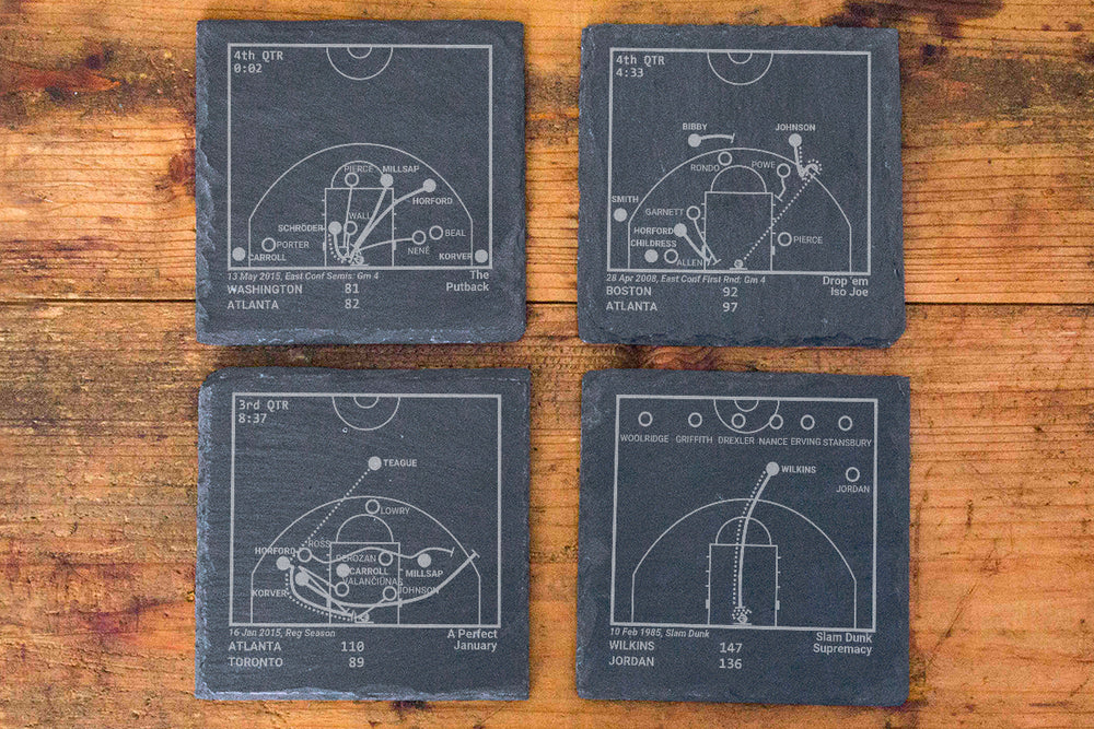 - Set of four coasters laser-etched with the Atlanta Hawks greatest moments.