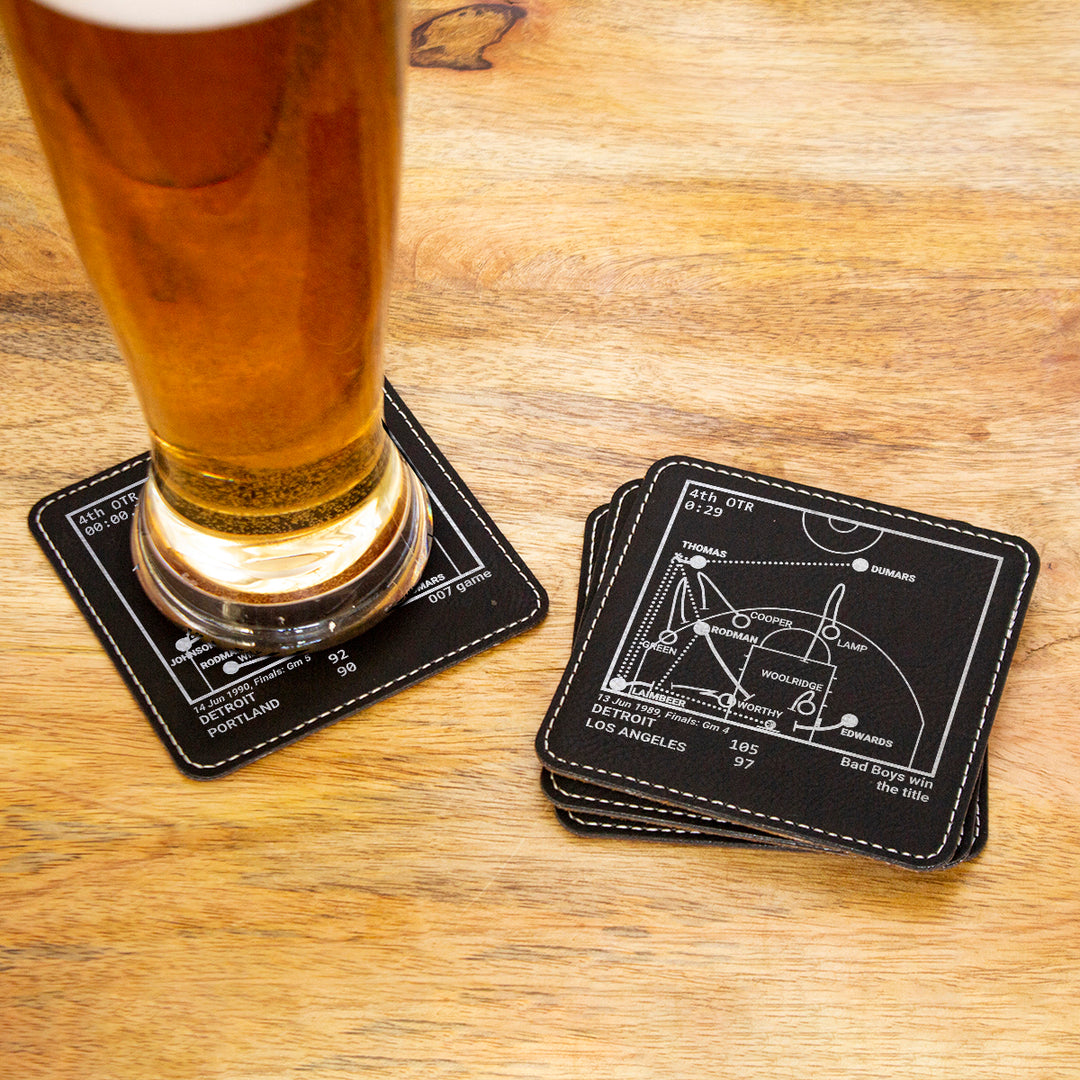 - Set of four coasters laser-etched with the Detroit Pistons greatest moments.