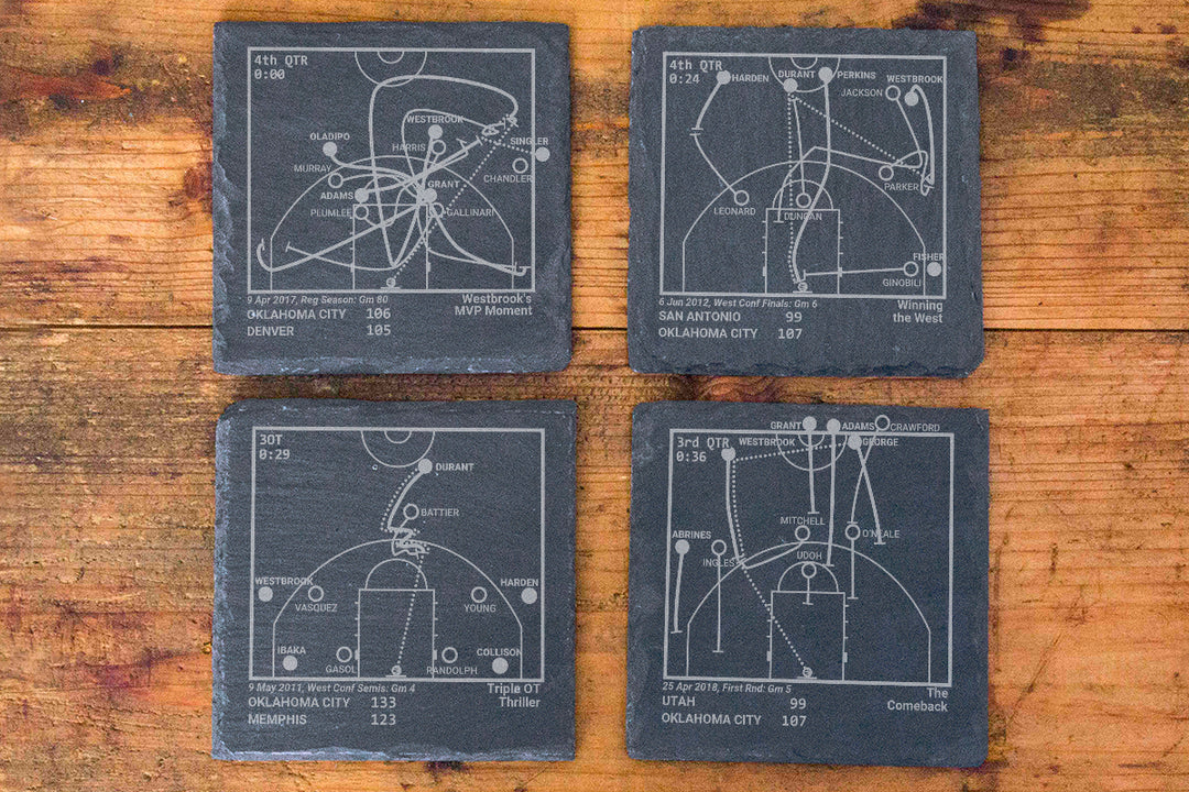 - Set of four coasters laser-etched with the Oklahoma City Thunder greatest moments.