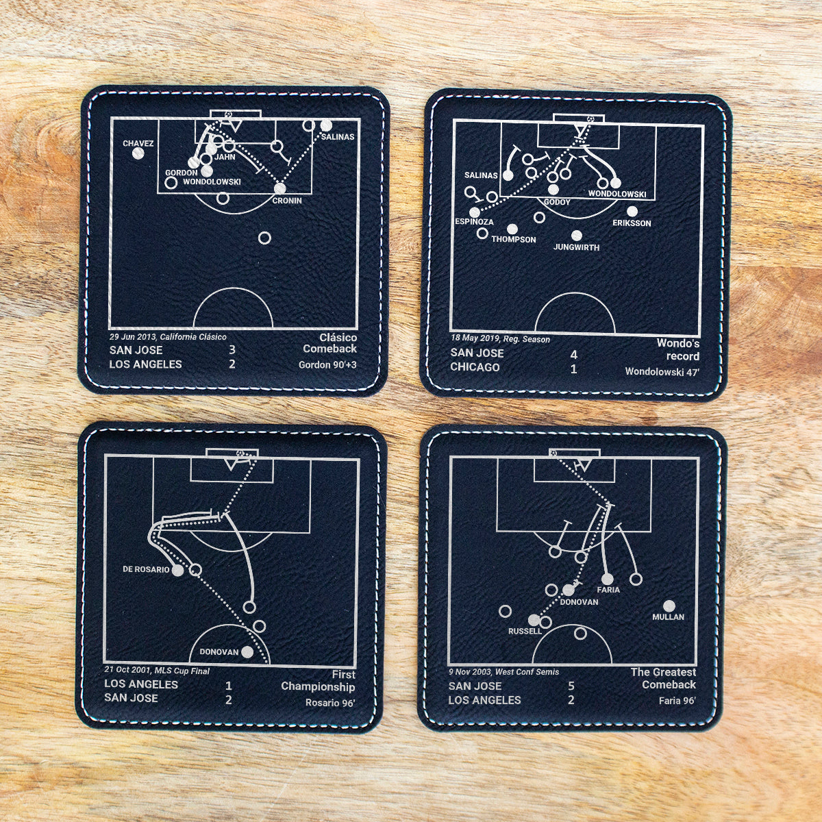 - Set of four coasters laser-etched with the San Jose Earthquakes greatest goals.
