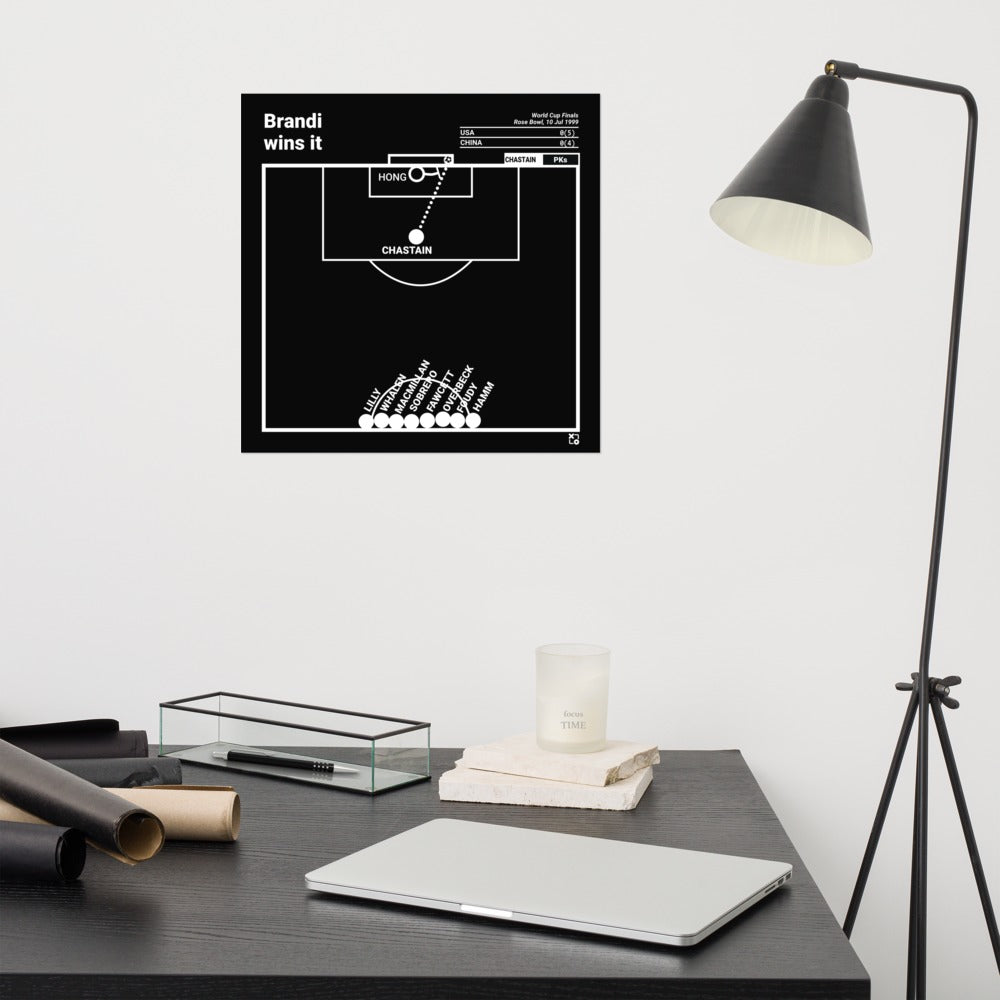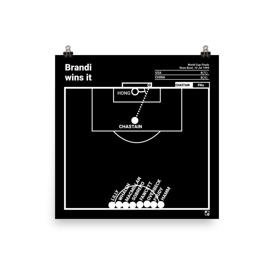 After a scoreless game and two scoreless overtime periods, the 1999 Finals against China went to penalty kicks. Carla Overbeck, Joy Fawcett, Kristine Lilly and Mia Hamm had already made their penalties and Briana Scurry had saved Liu Ying's penalty. That meant that if Brandi Chastain could hit hers, the US would win the World Cup. Chastain calmly set the ball, ran up and sunk it into the upper right corner of the net. Her celebratory shirt removal after winning the World Cup will go do down as the most iconic moment in Women's soccer and perhaps all World Cup history.