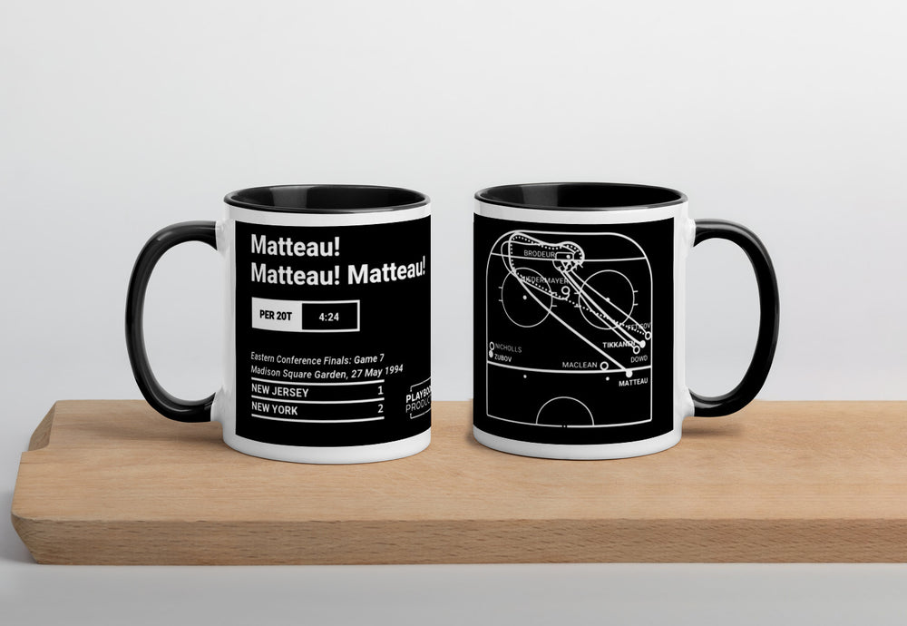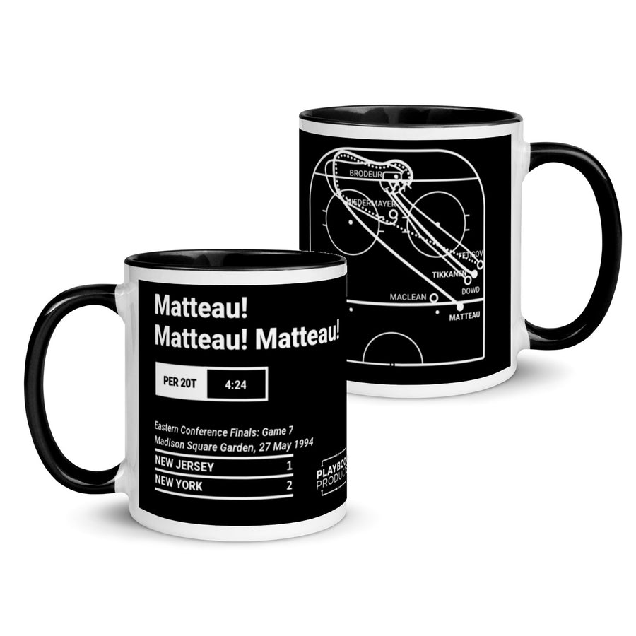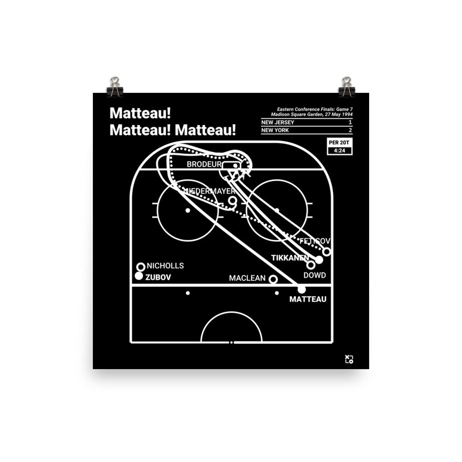 New York had fallen behind 2 - 3 to New Jersey in the Conference Finals, but Mark Messier delivered a hat trick in Game 6 to force Game 7 at home. With the Conference title on the line, the game went into double overtime tied at 1 apiece. Four minutes in Daniel Lacroix stole the puck and slotted it to Stephane Matteau, who was waiting in front of the net. Matteau hammered it home, and New York was on it's way to the Stanley Cup Finals with the announcers ringing out "Matteau! Matteau!"