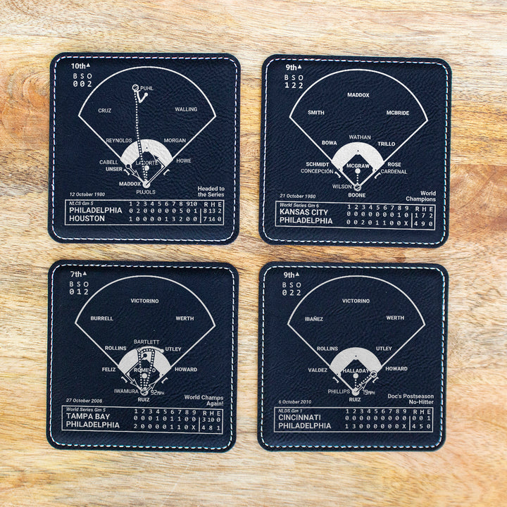 - Set of four coasters laser-etched with the Philadelphia Phillies greatest moments.