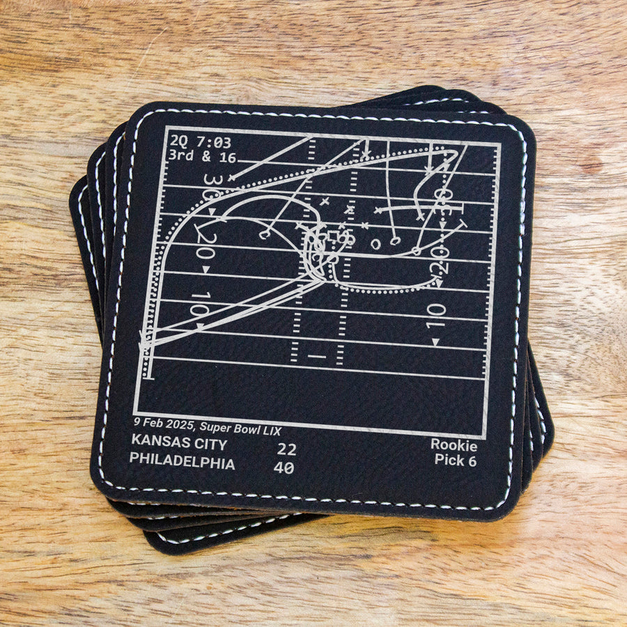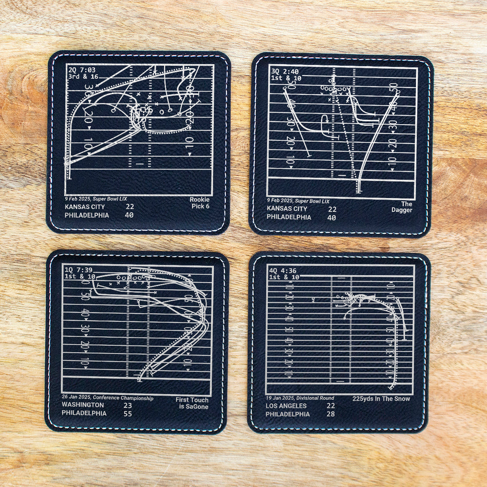 - Set of four coasters laser-etched with the Philadelphia Eagles greatest moments.