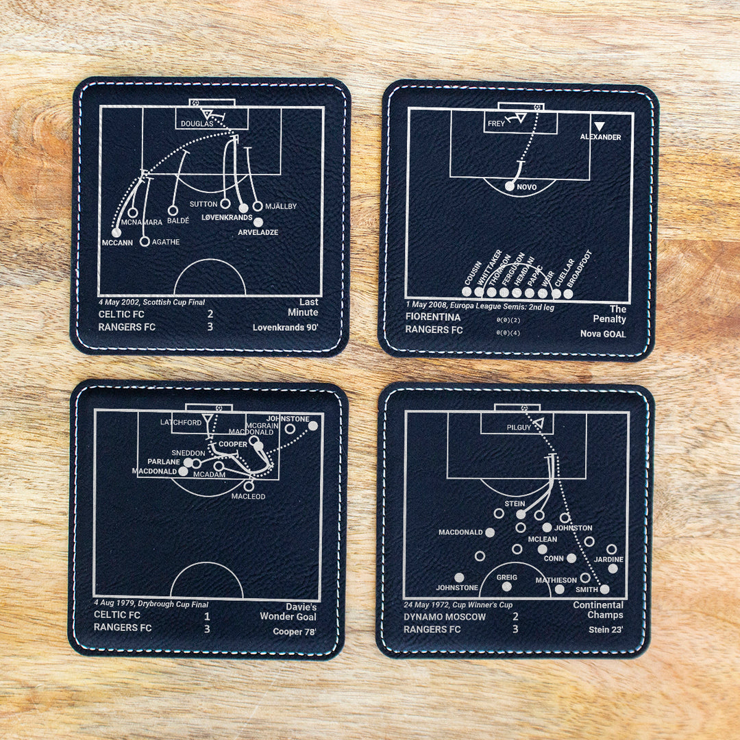 - Set of four coasters laser-etched with the Rangers F.C. greatest goals.